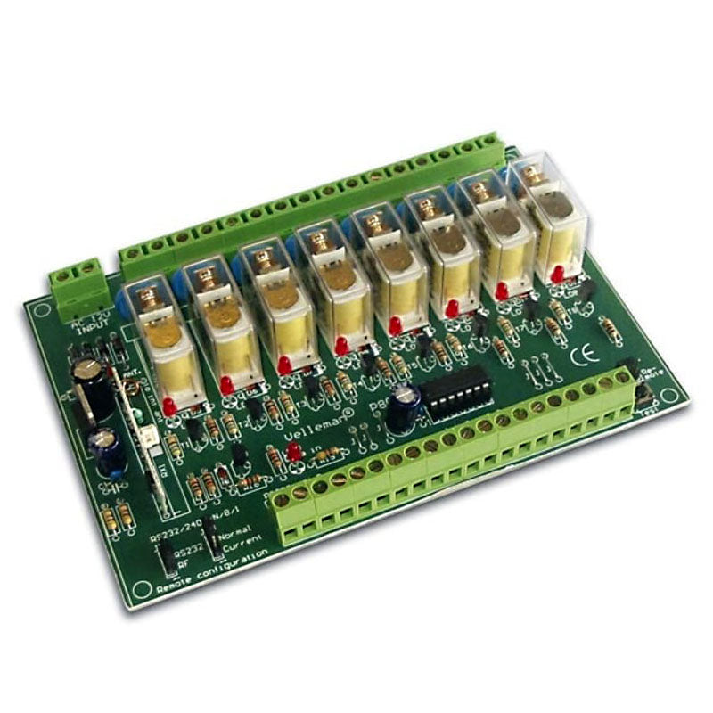 This relay card can be used in several ways : as a stand alone card addressed by switches or open collector outputs or remotely controlled through RS232. This card can also be remotely controlled using RF (radio frequency) signals by using the 8Channel RF Remote and a 455 MHZ receiver module. This card can also be addressed using RS232 commands so you may write custom applications in any programming language on any platform.