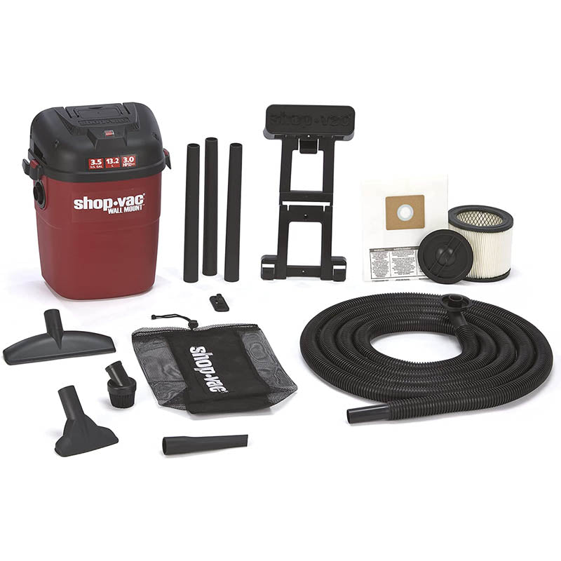 WALL MOUNT VACUUM: This wall mountable wet/dry vacuum has a 3.5gallon tank & a 3 peak horsepower motor. It offers cleaning convenience for the garage workshop or anywhere a handsfree vacuum is needed.