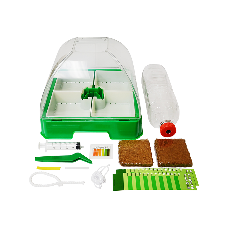 Complete greenhouse system for cultivating plants and vegetables in an indoor environment without soil using a modern Hydroponics system. The kit comes with a base adjustable translucent observation cover four growing trays fertilizer tank safe chemicals and bedding for propagating the growth of plants.