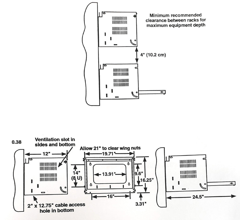 The 19 wallmount pivoting panel mount complies with EIA requirements. Holes are tapped 1032 in universal EIA spacing.