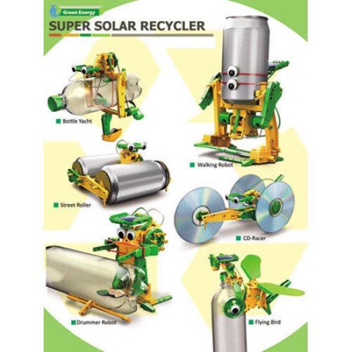 Think twice before discarding that 1985 CDROM don?t throw away that aluminum can and pick up that plastic bottle left under the couch. We can use them with our stateoftheart ecofriendly educational toy kit that will stretch your child?s imagination while allowing them to take part in the joy of recycling. The Super Solar Recycler Kit is powered completely by natural light so you never have to worry about batteries!