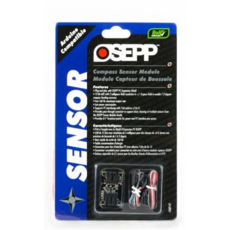 The OSEPP Compass Sensor Module is a 3axis digital compass for lowfield magnetic sensing. It utilizes the Honeywell HMC5883L stateoftheart high resolution magnetoresistive sensors an ASIC containing amplification automatic degaussing strap drivers offset cancellation and a 12bit ADC that enables a compass heading accuracy to within 12 degrees.