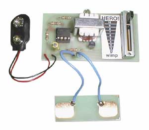 Are you a Hero or a Wimp? This kit will give you a chance to prove it! Just set the slide control to the Wimp position and place your fingers on the touchpads. You'll then receive a tingling sensation from the mild electrical voltage. If you can leave your fingers on the touchpads the neon lamp will go out. Now slide the control towards the Hero position and you'll find it's much more difficult to extinguish the lamp (as the tingling sensation becomes much greater). This kit is fun to build and fun to use.
