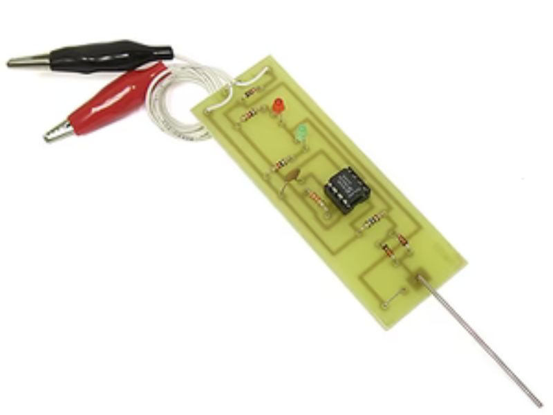 This kit features a visual indicator that consists of a red LED and a green LED. The red LED indicates a High (1) logic state and the green LED indicates a Low (0) logic state. This logic probe is small easy to build and easy to use.