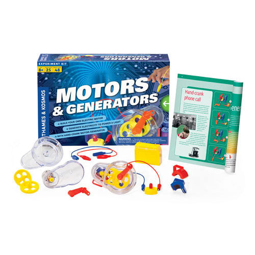 Electric motors and generators are in countless devices appliances and vehicles we use every day. They are an essential technology in our modern world. With this kit you can conduct 25 experiments to learn how an electric motor converts electricity into motion and how an electric generator does just the opposite converting motion into electricity.
