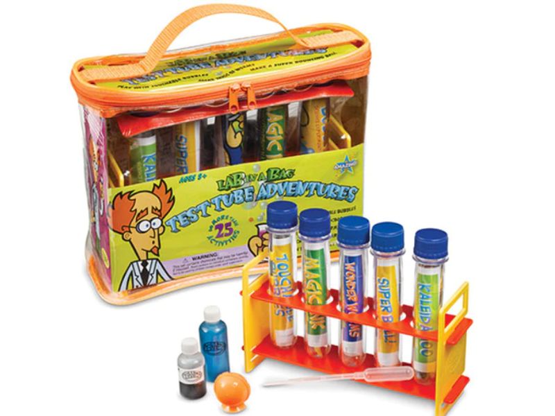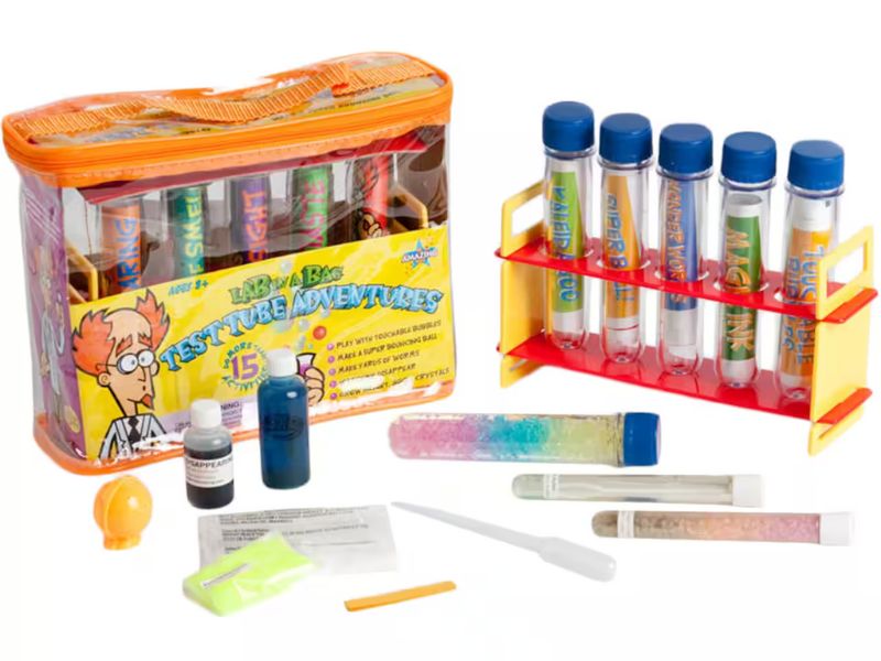More amazing activities in one small bag! Learn the secret of the Giant Test Tube! Play with touchable bubbles they don't pop! Learn how plastic molding works by making your own super bouncing ball make up to 20 feet of slimy gooey InstaWorms. Write secret messages with disappearing ink you make yourself.