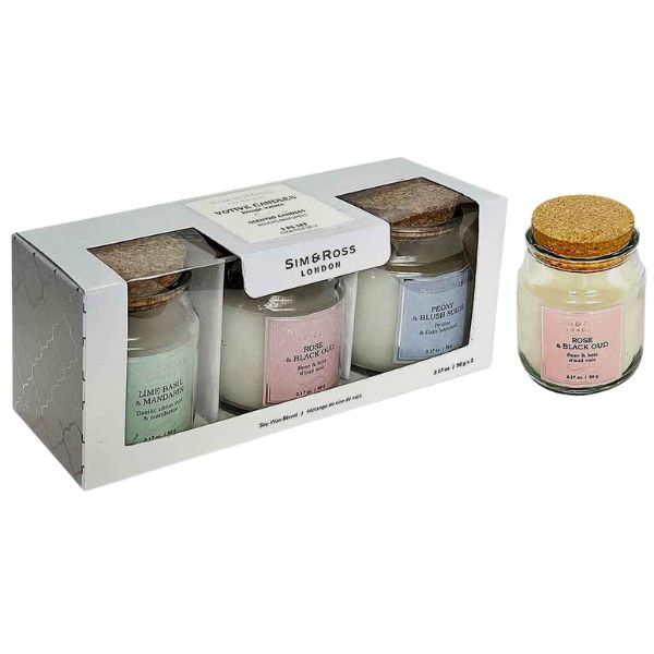 The Sim & Ross Soy Wax Scented Votive Candles set in glass jars with essential oils is made with a natural highquality soy/paraffin wax blend. The single cotton wick candle burns cleanly and slowly and lasts up to 15 hours. Each set comprises Lime Basil & Mandarin Peony & Blush Suede and Rose & Black Oud.