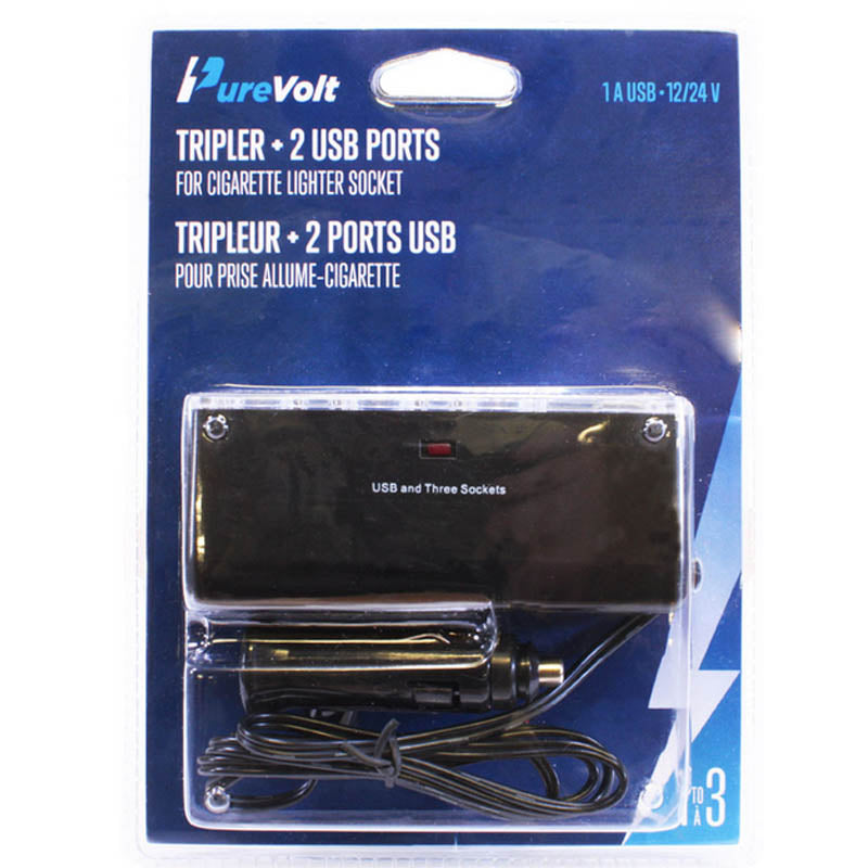 This Purevolt triple cigarette lighter adapter is a must have to install in your vehicle. It has 3 cigarette lighter sockets that can be used to plug in your GPS dash cam seat heater and more. This adapter also has 2 integrated USB ports allowing up to 2 devices to be charged quickly and simultaneously. In addition a safety fuse is installed there to prevent overheating overloading and short circuits. Input: DC 12/24V through cigarette lighter socket3 cigarette lighter sockets 12/24V2 5V USB ports 2.1 A total 5A fuse protected1M cable with LED power indicatorUse your existing USB cables for a fast charge of your devices