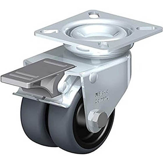 Light duty twin wheel swivel caster with top plate fitting and ?stopfix? brake Wheel with thermoplastic rubber tread with polypropylene wheel center