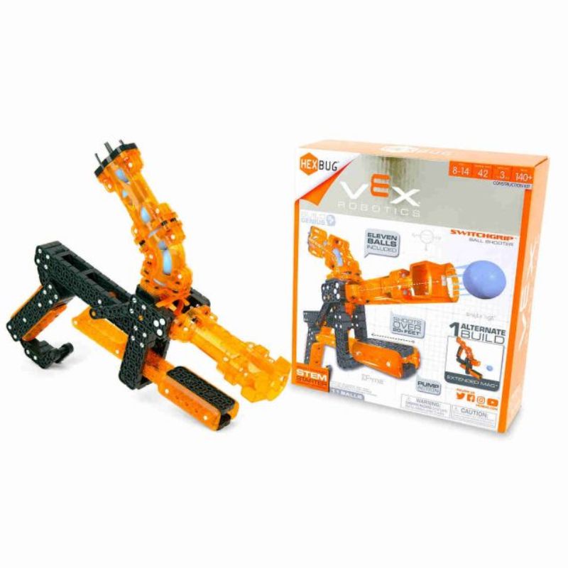 Assemble an imaginative blaster with the VEX Robotics SwitchGrip Ball Shooter by HEXBUG. Fill your loader with ammo and perform the launcher?s signature pumping action to send projectile balls flying over 20+ feet! Intended as an entryway to STEM this toy aims to curate an engineer?s mentality through one of the most effective play patterns.