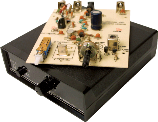 A front panel switch lets you choose between two crystals we include one you can add another of your choice. A builtin TR switch allows breakin operation. Of course these transmitters interface perfectly with our QRP Minirig receivers and our CMOS CW keyer!