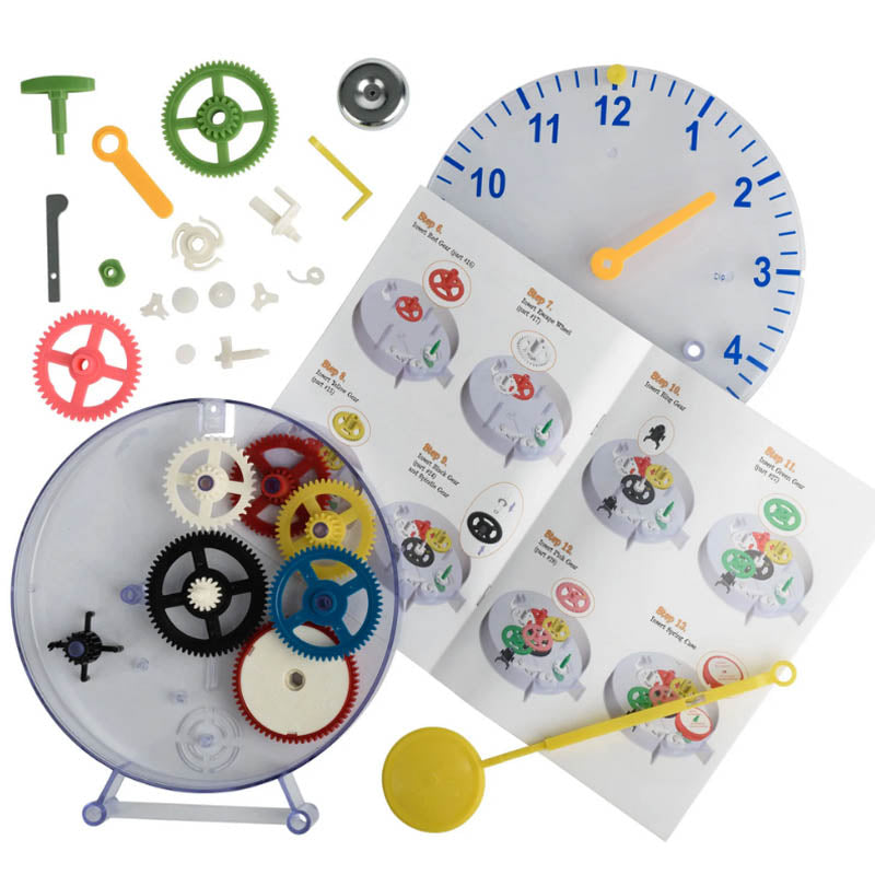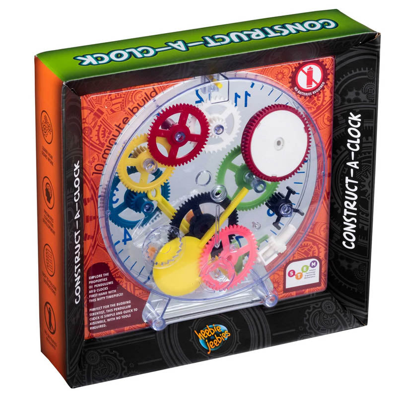 It is springdriven so no batteries required – once you’ve finished construction just wind it up and watch the cogs turn and tick away! It will run for over 8 hours with one winding – then your child can reset the time rewind the clock and away it goes again. A great way to teach kids from ages 610 about time and how gears work!