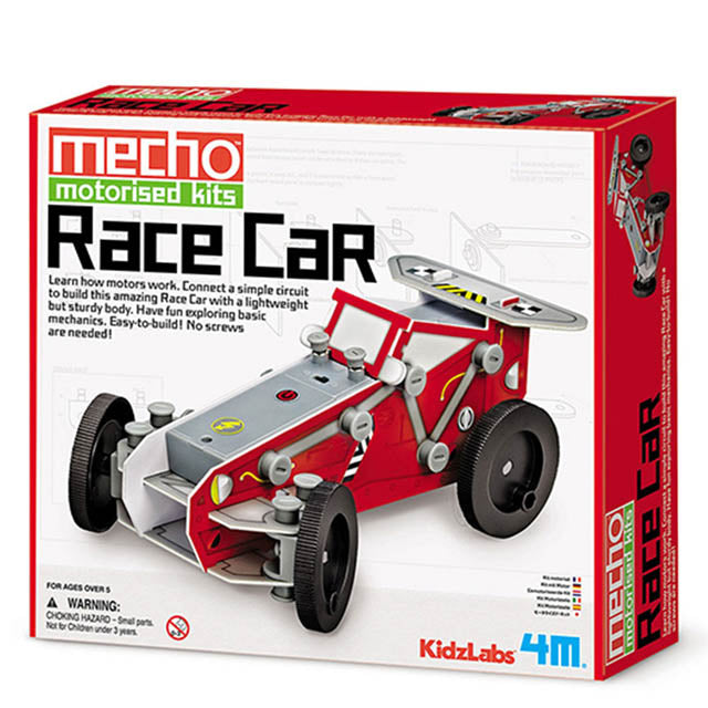 Be a young mechanical engineer! Learn how the motor works. Explore important mechanisms like pivots linkages and levers. Connect the circuit to build this amazing Race Car with a sturdy lightweight and colourful body. Make it your very first project in mechanical science!