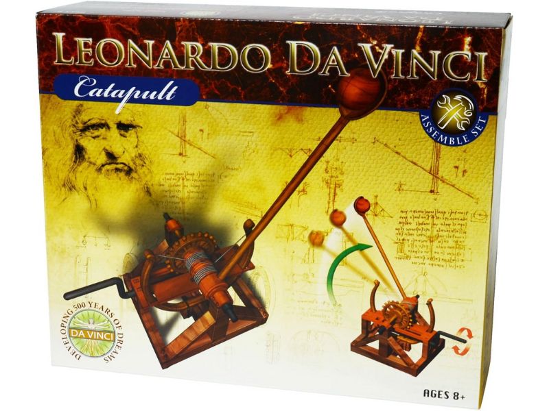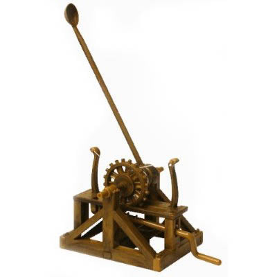 Leonardo da Vinci improved upon the alreadyestablished catapult design when he introduced his own vision of the ageold military launching device. This design uses a double leaf spring to produce a great deal of energy in order to propel stone projectiles or flammable materials over large distances. A hand crank on the side of the catapult was used to load the spring.