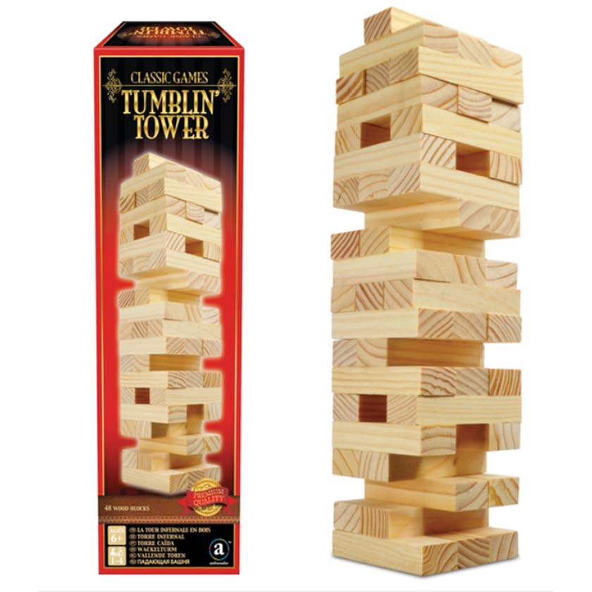 With this 48 wooden block set the aim of the game is to stack them up 3 per row then try to remove a piece from each row and then place it on top of the stack. How long before the tower tumbles? For 14 players.