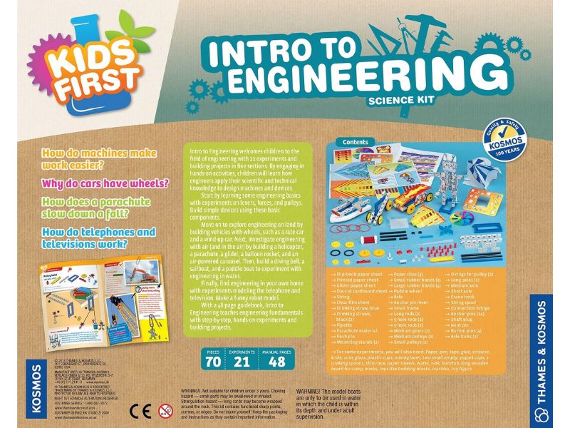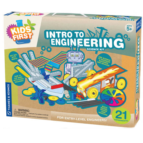 Intro to Engineering from Thames and Kosmos uses handson activities to demonstrate how engineers design machines and devices. Start by learning some engineering basics with experiments on levers forces and pulleys. Build simple devices using these basic components. Move on to explore engineering on land by building vehicles with wheels such as a race car and a windup car. Next investigate engineering with air (and in the air) by building a helicopter a pinwheel a parachute a glider a balloon rocket and an airpowered carousel. Then build a diving bell a sailboat and a paddle boat to experiment with engineering in water.Finally find engineering in your own home with experiments modeling the telephone and television. 25 experiments are presented in a 48 page guidebook.