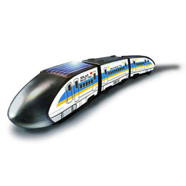 OWI is proud to introduce their Solar Bullet Train mini solar kit. This kit entices students and train enthusiasts alike to learn about the environmental benefits of renewable energy. Two interlocking cars attach to the engine allowing young builders to focus on selfmotivation perseverance and manipulation. The Solar Bullet Train is an excellent beginner building kit designed to teach how solar power is used to drive a small motor. Its 18 parts snap together and are secured with only four screws. Train enthusiasts of all ages will enjoy building this amazingly fast ecofriendly train and watch it travel without rails. All Aboard the fastest train under the sun!