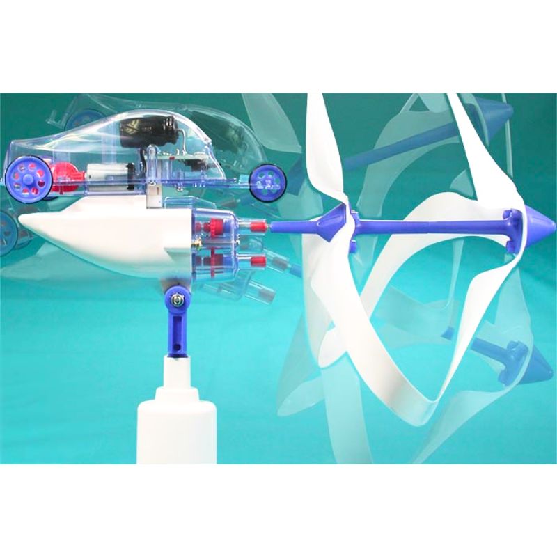 The car with its movable front wheel may be set to run in a circle allowing users to witness the conversion of wind power into working electricity before their very eyes. Two types of gears can be selected to allow generation of higher amounts of power depending on wind speed. Stand features builtin weight to keep the unit steady on a flat surface. Stand also features grip so that it may be held in the hand while running to generate wind power. The rechargeable vehicle runs for 12 minutes for each 510 minute of charge.