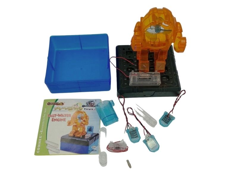 Learn how circuitry and salt water can run an electric fan! Bright orange robotshaped fan provides hours of entertainment. Build the science kit and then play with the toy! For ages 8+ Connex is a series of educational science kits that provide useful knowledge about simple physics. Smartly designed each Connex kit allows kids to snap the pieces together with ease and breeze. Simply snap all key components and modules together to start and pull apart once finished. Encourages kids to experiment on their own for additional learning. Best of all each kit can snap to another to integrate functions and double (triple quadruple) the fun!