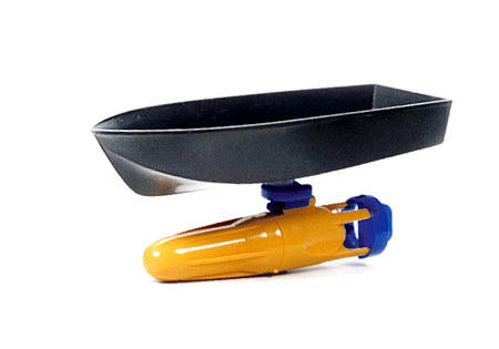 Submarine motor comes with boat hull. Suction cup is supplied for easy attachment to boat. Polystyrene boat can be easily modified and painted.