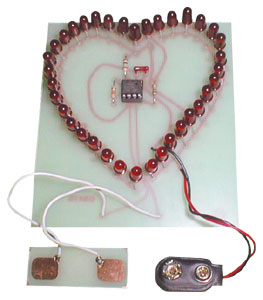 This fun kit features a bright red heart which has the ability to flash at various rates for different persons. Place your fingers on the contacts and see how fast the heart will throb! Kit features IC circuitry and 36 jumbo red LEDs.