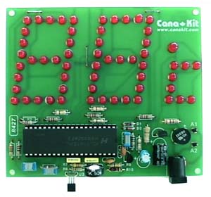 A digital thermometer with a large 2 (5cm) high display that is visible from a distance. It includes two digits made up of 25 LEDs each plus a degree Celsius symbol (?C). It is based on two Integrated Circuits: the 7107 voltmeter and the LM35Z temperature sensor. The circuit incorporates a builtin power supply with an AC/DC adapter jack.