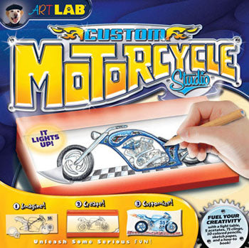 If you?re looking for adventure then look no further than the Custom Motorcycle Studio by SmartLab. This allinclusive art kit puts young gear heads behind the handlebars of their dream motorcycle. Kids will learn how to illustrate custom motorcycles using a light table colored pencils acetate overlays printed with simple traceable outlines of motorcycle frames and 71 traceable cling accessory addons. The Custom Motorcycle Studio by SmartLab includes instructions for creating 21 custom bikes but that's just the beginning! Let your imagination take you on a wild ride.