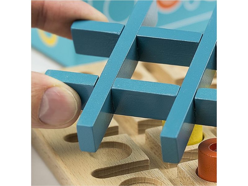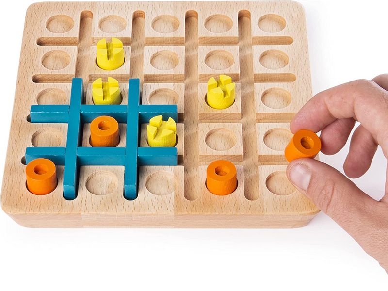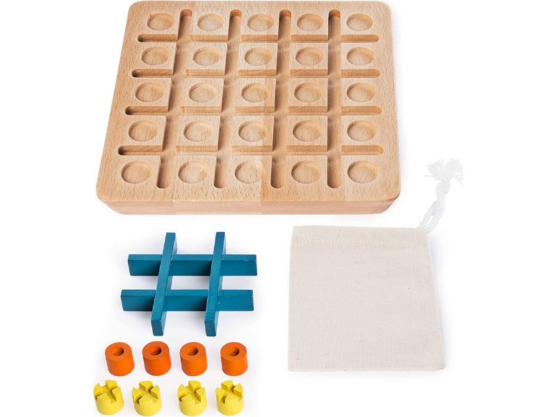 Mastered Tic Tac Toe? Move on to Tic Tac Two the challenging strategy game! Players choose X or O before play begins. On your turn either place a peg within a ninespace blue grid or move the blue grid to a different location on the 25space wooden board. If you’ve got your eye on the prize get three in a row horizontally vertically or diagonally and you win! This solid wood set can weather family board game nights for years to come! Give your brain a workout with Tic Tac Two!