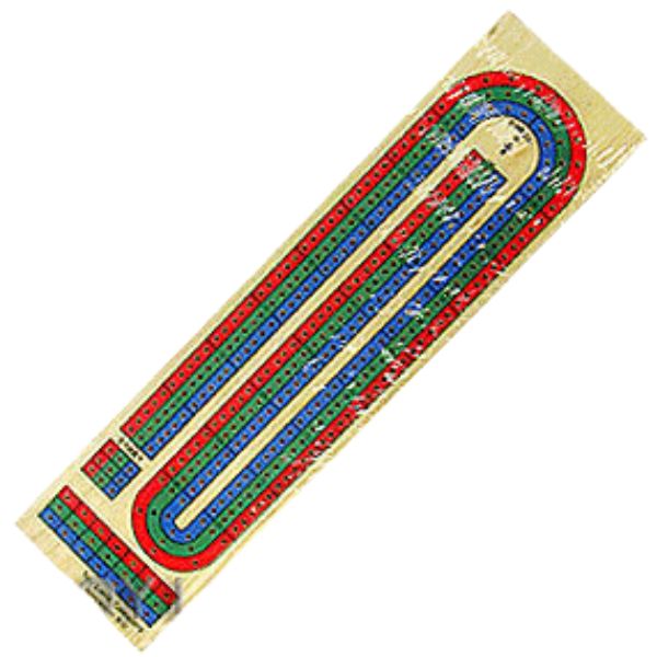 Cribbage board with 3 color lanes. Each piece measures 4″ x 15″ x 0.8″. Includes 9 plastic pegs (red blue green color) with instruction sheet. Shrink wrapped with a hang tab.