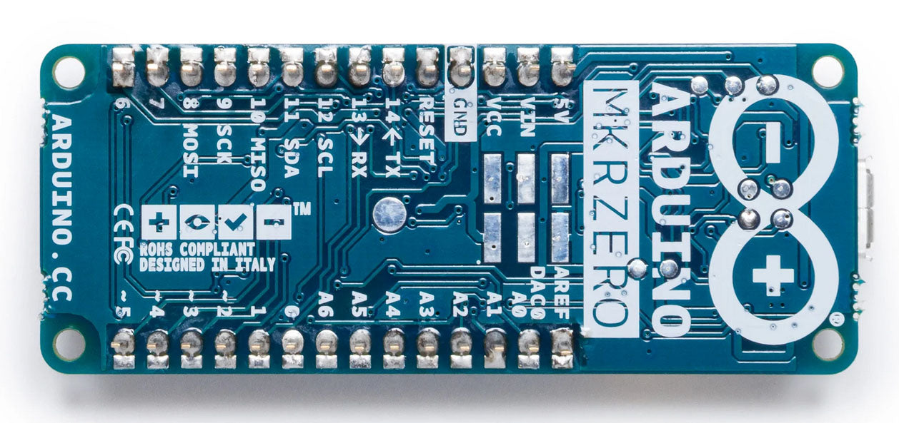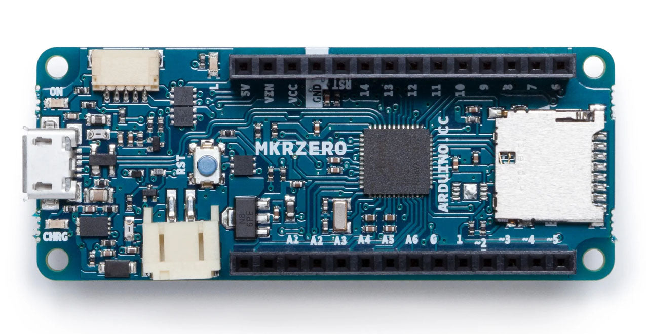 Arduino's MKRZero brings users the power of a Zero in the smaller format established by the MKR form factor. The MKRZero board is a great educational tool for learning about 32bit application development. It has an onboard SD connector with dedicated SPIs that allows users to interact with music files using the Arduino Sound library and I2S library with no extra hardware.