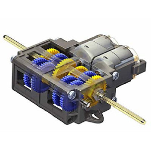 The Tamiya #70168 double gearbox is a compact unit with two independent motors and gear trains. The kit includes two motors and all gears and parts to build any of the four possible gear ratio configurations ( 12.7: 1 38: 1 115: 1 and 344: 1) . Although it is not typical it is possible to assemble each side with different gear ratios. There are two possible output axle locations ( for any given gear ratio only one output location is possible) .