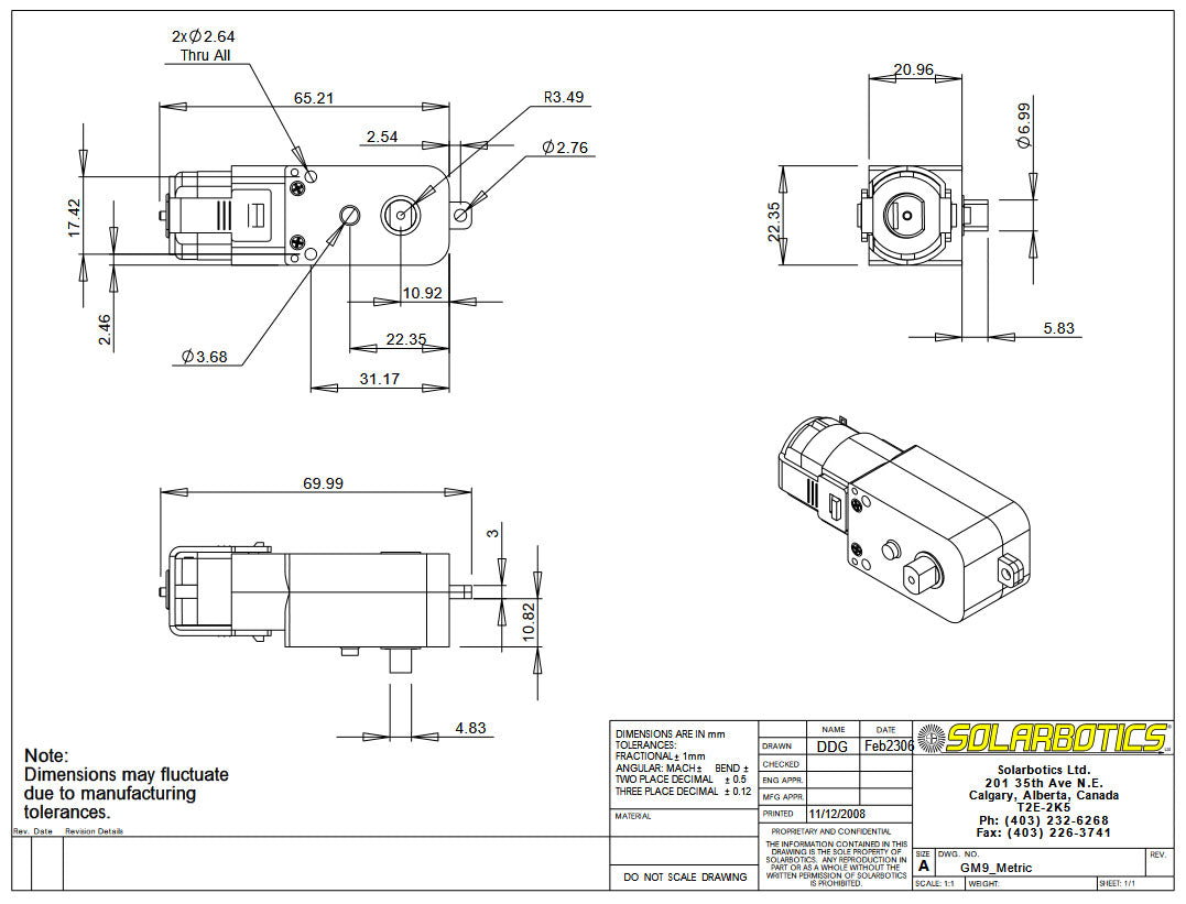 Gear Motor 9 143:1 90 Degree Shaft The GM9 is similar to the GM3 gear motor but runs at nearly twice the speed. This motor goes 40RPM at 3V drawing 400mA at stall generating 44.4 in*oz torque (free running @ 50mA). With a 7mm doubleflat output shaft a builtin clutch and builtin mounting screw holes. There is no output shaft on the other side. These units have an overall size of 70.2mm x 30.4mm x 22.6mm thick or 2.76 x 1.20 x 0.89 thick and weighs in at 31.5g or 1.13oz.