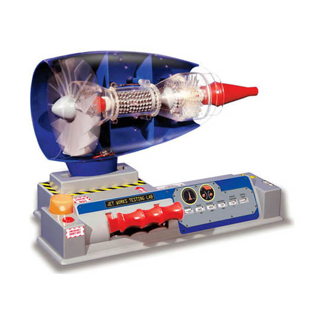Build a Working Model of a Jet Engine Learn the science behind why a jet engine works by assembling this replica plastic model. Once built you'll control the thrust and turbine speed. Battery operated moving parts and lights help bring the simulation to life. Includes a color poster with instructions and fun facts. Requires 2 AA batteries scissors and screw driver (all not included).