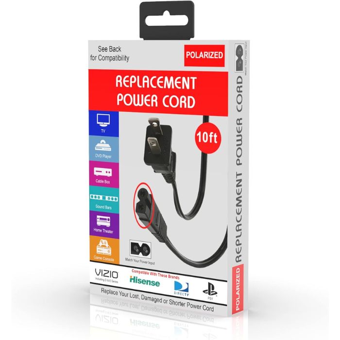10ft Replacement Polarized Power Cord Works with VIZIO and Hisense TVs DirecTV Verizon and Comcast Cable Boxes VIZIO and Sanyo Soundbars BluRay and DVD Players